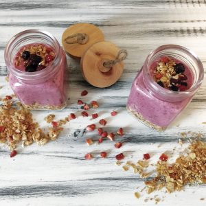 Un postre sencillo que combina a la perfección texturas y sabores, el resultado es simplemente delicioso. Ingredientes (2 ó 3 personas): – 1 yogur (griego o de soja para versión vegana) – 1 chorrito de bebida vegetal de coco y anacardos – 1 platano – 200g de frutos rojos congelados – 4 cucharadas de Muesli La elaboración