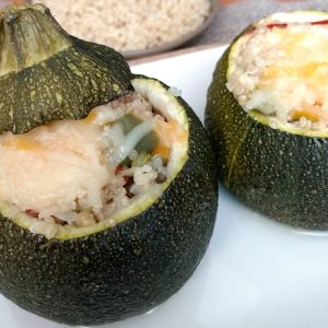 Una receta de las de triunfo seguro, estos calabacines rellenos son perfectos para una celebración especial! Ingredientes (2 personas): – 2 calabacines tipo bola – 1/2 pimiento rojo – 1/2 pimiento verde – 1/2 pimiento amarillo – 1/2 cebolla – 120g de Quinoa Real – Cebolla – 2 cucharadas de levadura nutricional – Queso (opcional) – AOVE –